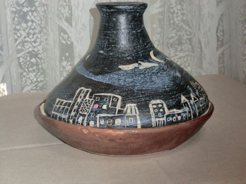 黒化粧を施し 線掻き落とし後 下絵の具にて 都会の風景を・絵付けしました。