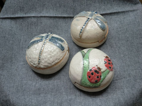 蓋に彫り込んで 昆虫模様を入れ、絵付けしています。